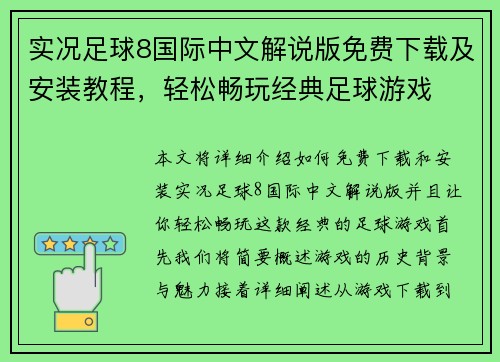 实况足球8国际中文解说版免费下载及安装教程,轻松畅玩经典足球游戏
